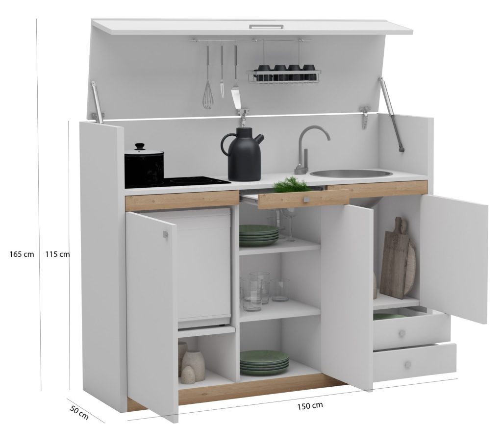 - Açık Raf ve Çekmeceler: Tabak, bardak ve kuru gıda depolaması için birden fazla açık raf ve düzenleyici çekmece bulunur.