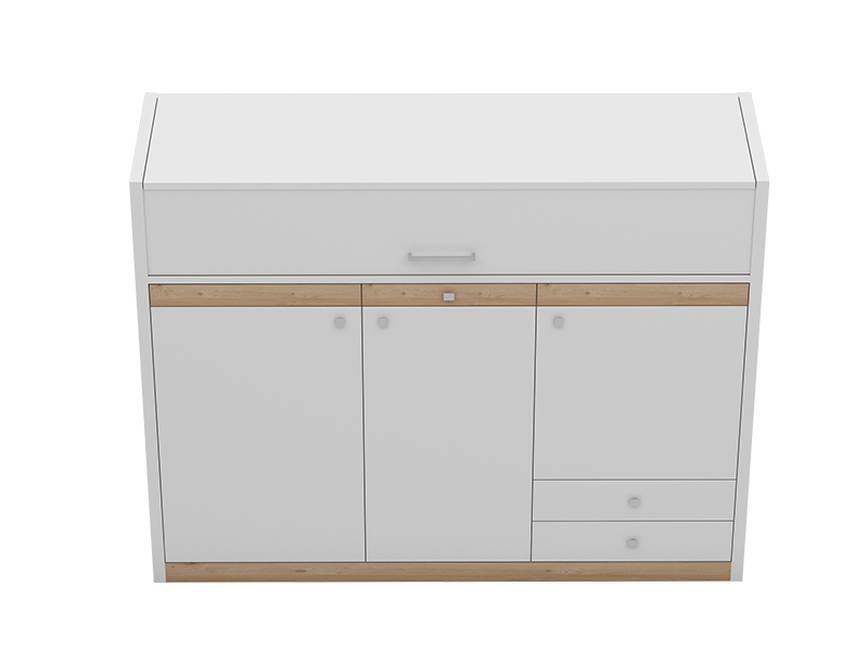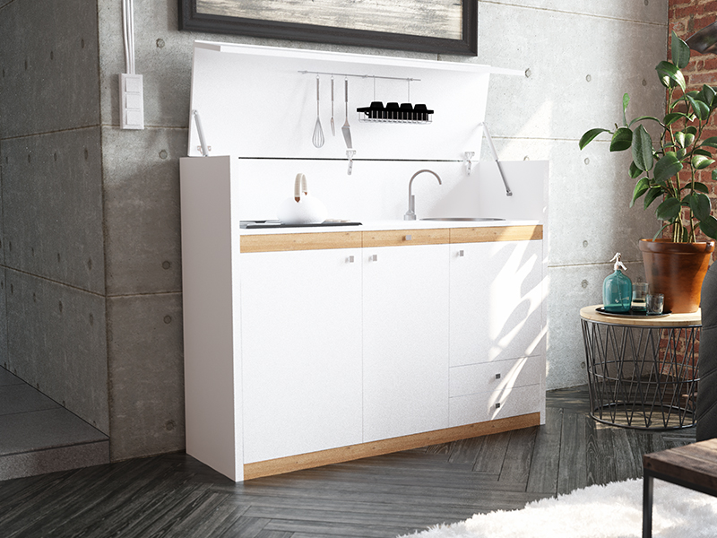 - Bulaşık makinesi, mini buzdolabı veya çamaşır makinesi gibi cihazlar için özel olarak ayrılmış, ölçülere uygun bölmeler içerir. (Görselde mini bulaşık makinesi için ayrılmış bir alan görülmektedir.)