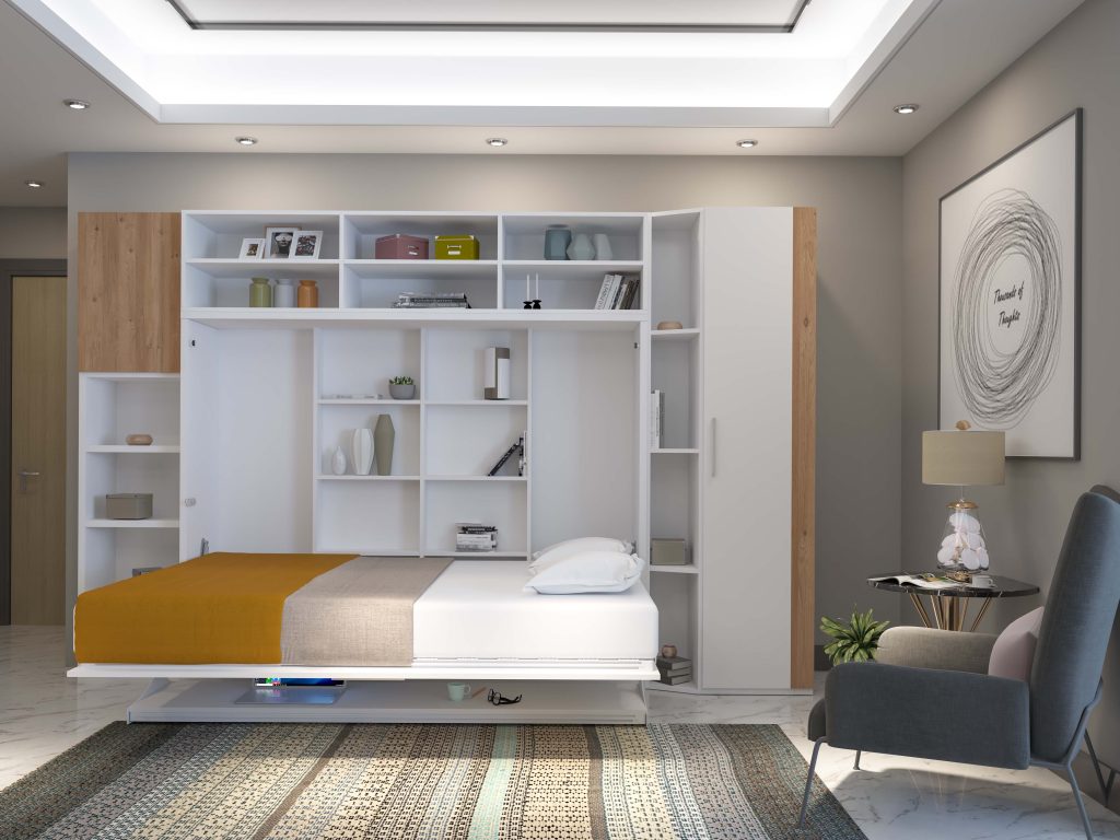 Bu sistemin kalbi duvar yatağı (murphy bed) mekanizmasıdır. Gündüzleri yatak dikey olarak yukarı kaldırılır ve şık bir dolap kapağı görünümü alır. Böylece odanın ortasında geniş bir hareket alanı açılır.