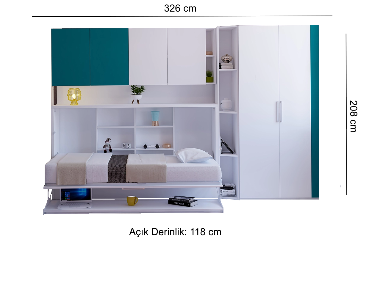 Fonksiyonel Tasarım: Yatak, masa ve depolama alanı tek bir sette birleşerek pratik bir yaşam alanı sunar.