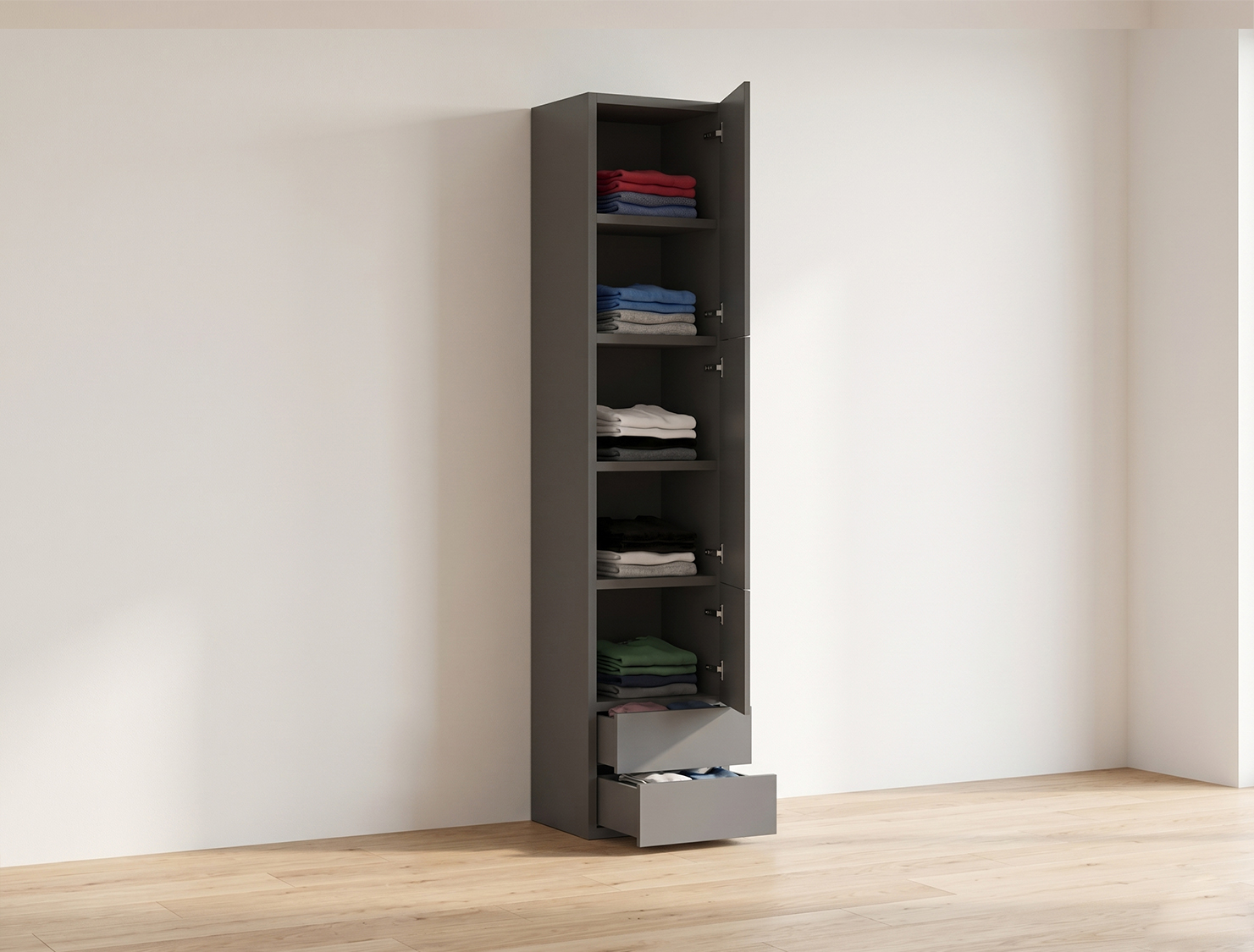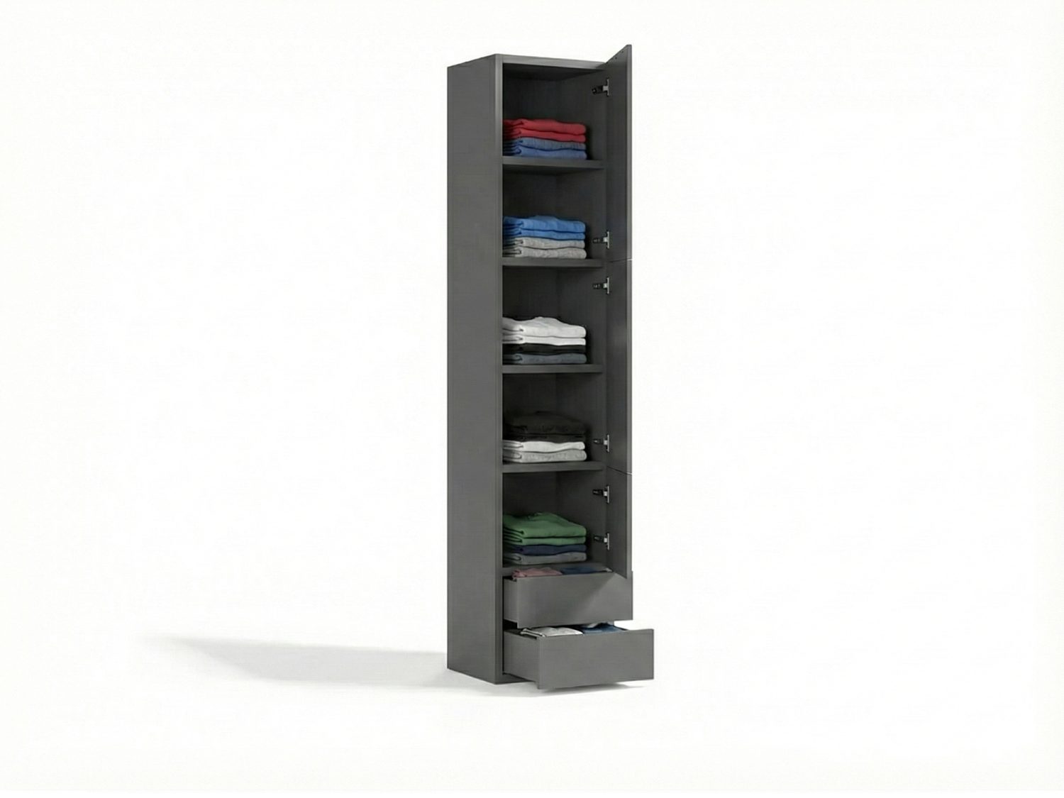 açık bir bölmeye sahip bu gardırop, hem uzun kıyafetleriniz hem de kazak, kot pantolon, şapka, el çantası ve