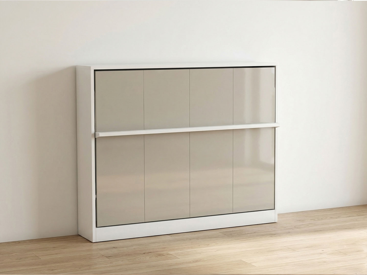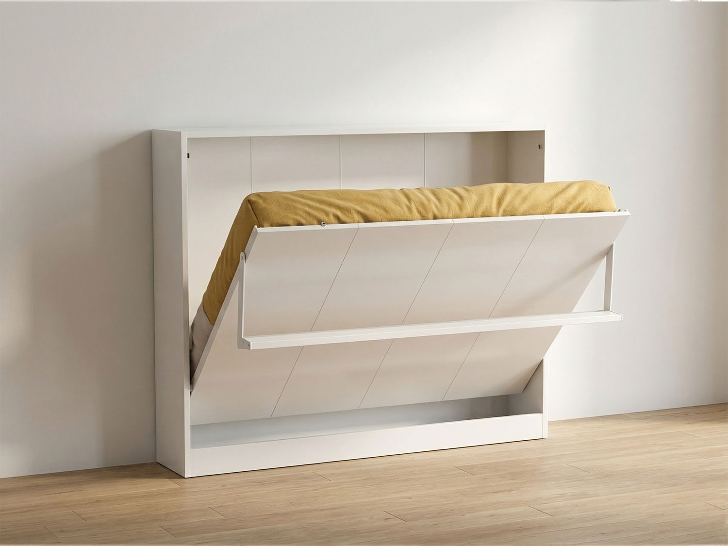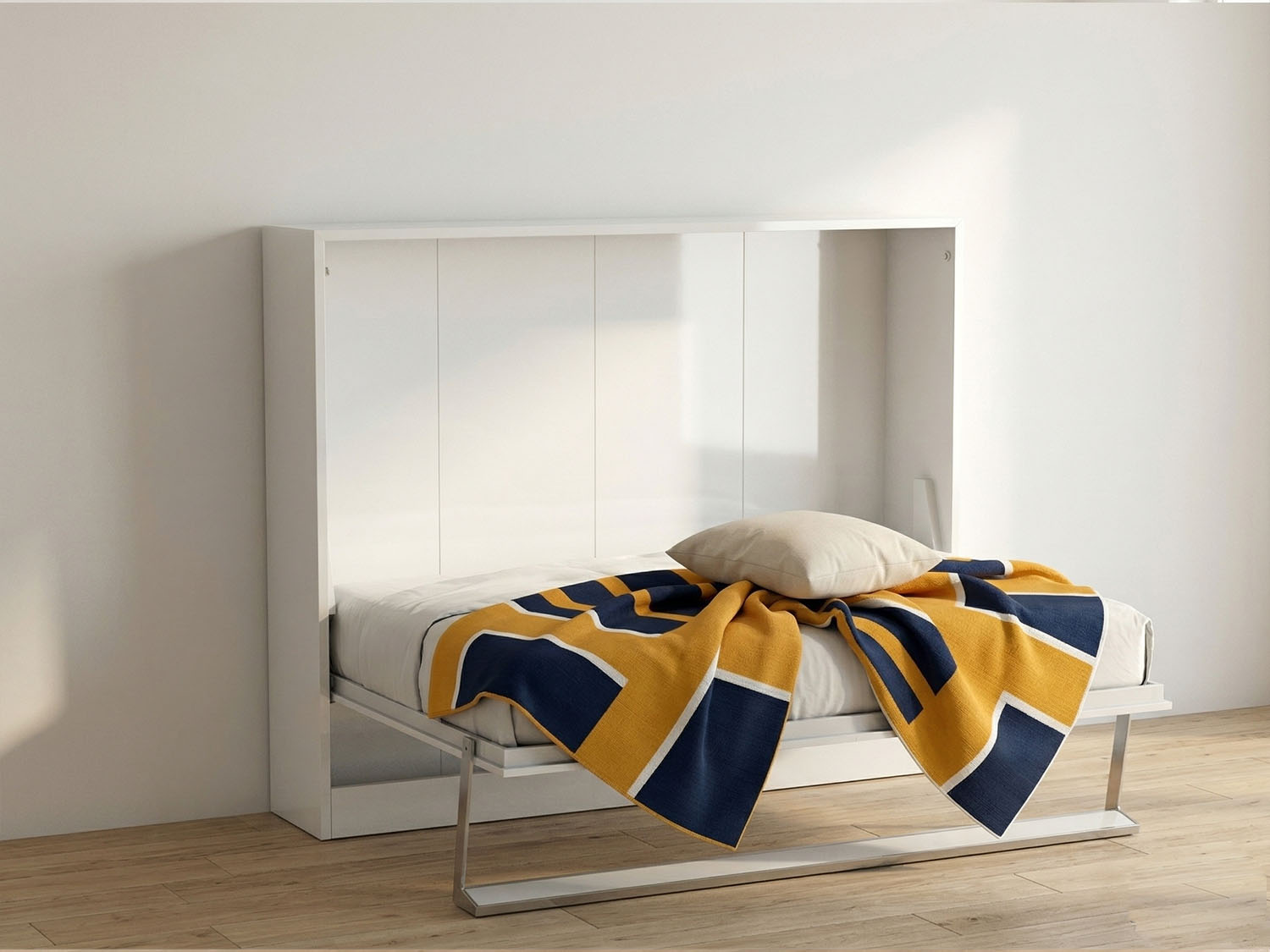 Akıllı yan açılır duvar sistemi sayesinde tek bir hareketle yatağa dönüşür, kapandığında ise şık bir mobilya görünümü sunar.