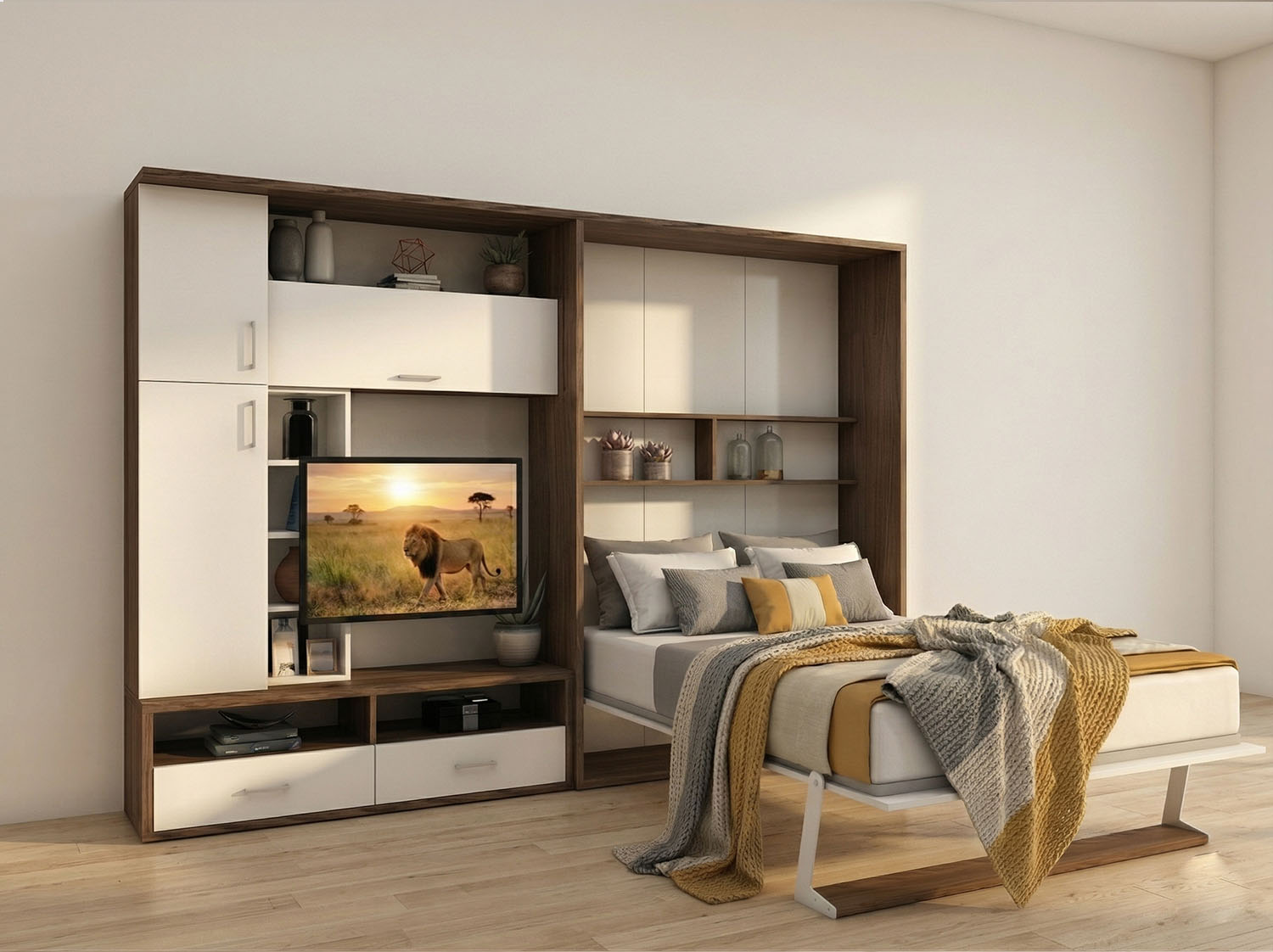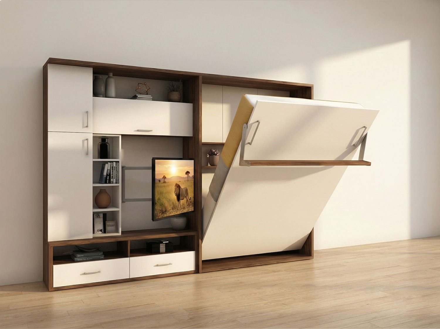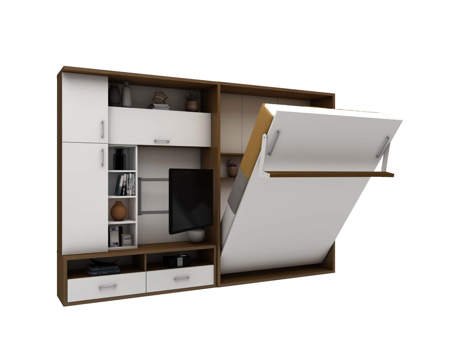 Çift kişilik yatağınız sürgü ray üzerinde sağa sola hareket eden vitrin kapağınızın arkasında gizlidir. Üniteniz yatak kapalı konumda iken sadece dekoratif bir TV ünitesi görünümündedir.