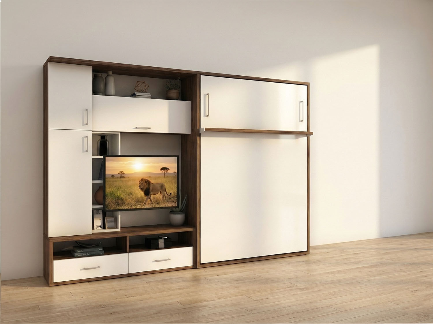 Tek bir mobilya üzerinde gizlenmiş çift kişilik dikey açılır yatak, TV ünitesi, vitrin alanı, kitaplık ve ekstra dolap özellikleri ile alan tasarrufu sağlayan Diva Salon eksiksiz ve yenilikçi bir duvar ünitesi.